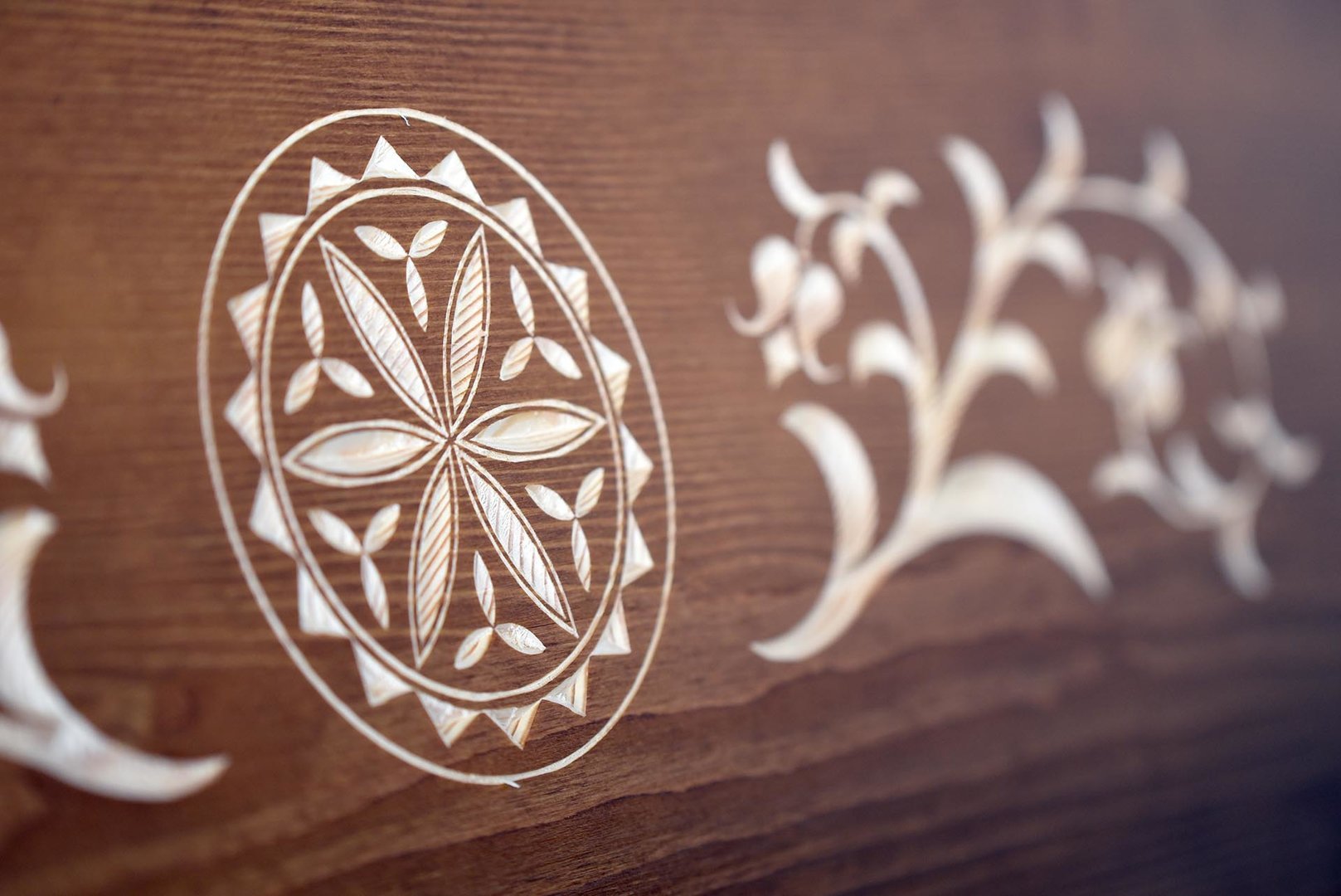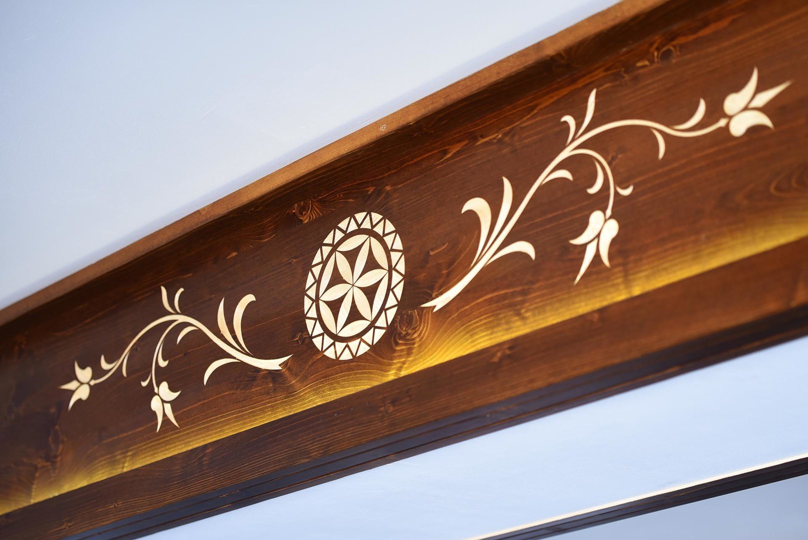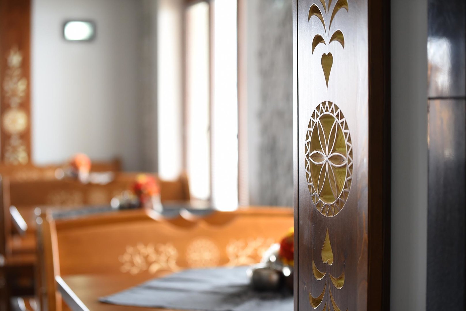 можна пасядзець у двенастоместнуй стол, і любавацца на гевонт панарамнае акно, памерам 5х3 метраў. Высокая на 6 метраў, трохкутная пакой аздобленая дрэвам і стылізаваны пад хаціну.